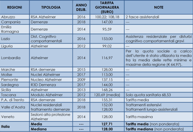 Figura 2. Panoramica sulle rette medie per regione riguardanti i malati di demenza. Fonte: luoghicura.it