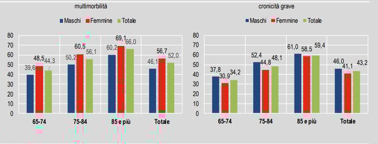 Nel 2019, circa 7 milioni di over 65, il 52% degli over 65, presentano multimorbilità, ovvero riferiscono almeno tre patologie croniche. L’incidenza cambia se analizziamo meglio le diverse fasce d’età.